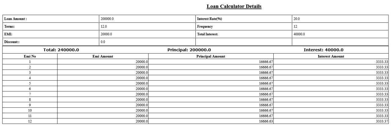 The principal amount is Rs 2,00,000 and the loan terms include an interest rate of 20% for 12 Months. Using the flat-rate method to calculate the EMI,